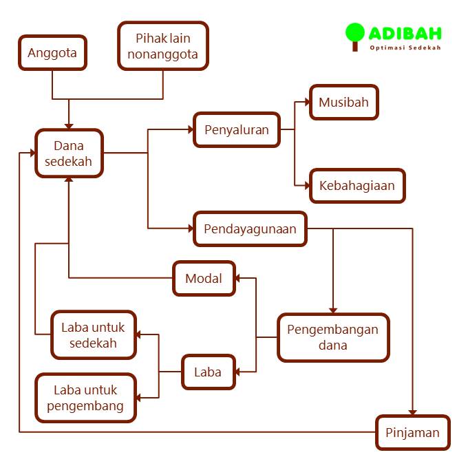 Adibah adalah model pengelolaan sedekah dalam suatu komunitas. Model ini mendistribusikan dana sedekah pada dua hal, yaitu penyaluran dan pendayagunaan. Untuk penyaluran, dana sedekah digunakan sebagai bantuan kepada anggota komunitas yang mengalami musibah dan hadiah kepada anggota komunitas yang mendapatkan kebahagiaan. Sedangkan, untuk pendayagunaan, dana sedekah digunakan sebagai pinjaman bagi anggota komunitas yang memerlukan pinjaman dana dan modal usaha bagi anggota komunitas yang memerlukan modal usaha. Secara sederhana, skema Adibah dapat dilihat pada gambar berikut: